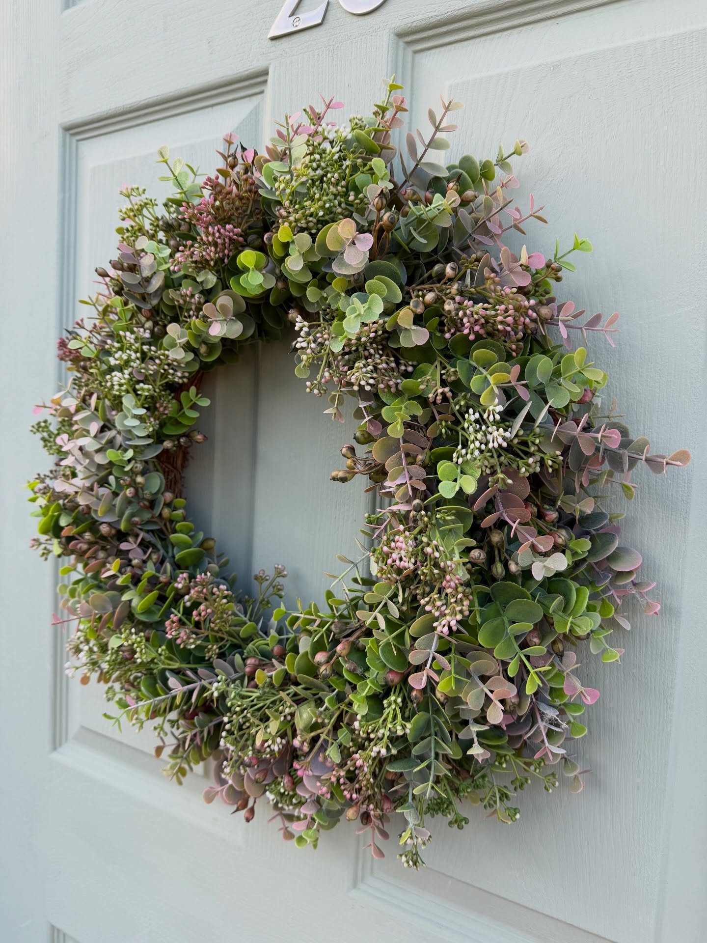 The overall palette is calm and considered: silvery sage, dusty pink, and fresh green in equal measure. It works equally well on a front door or inside the home, and feels at home across spring and summer without looking seasonal in a heavy-handed way.