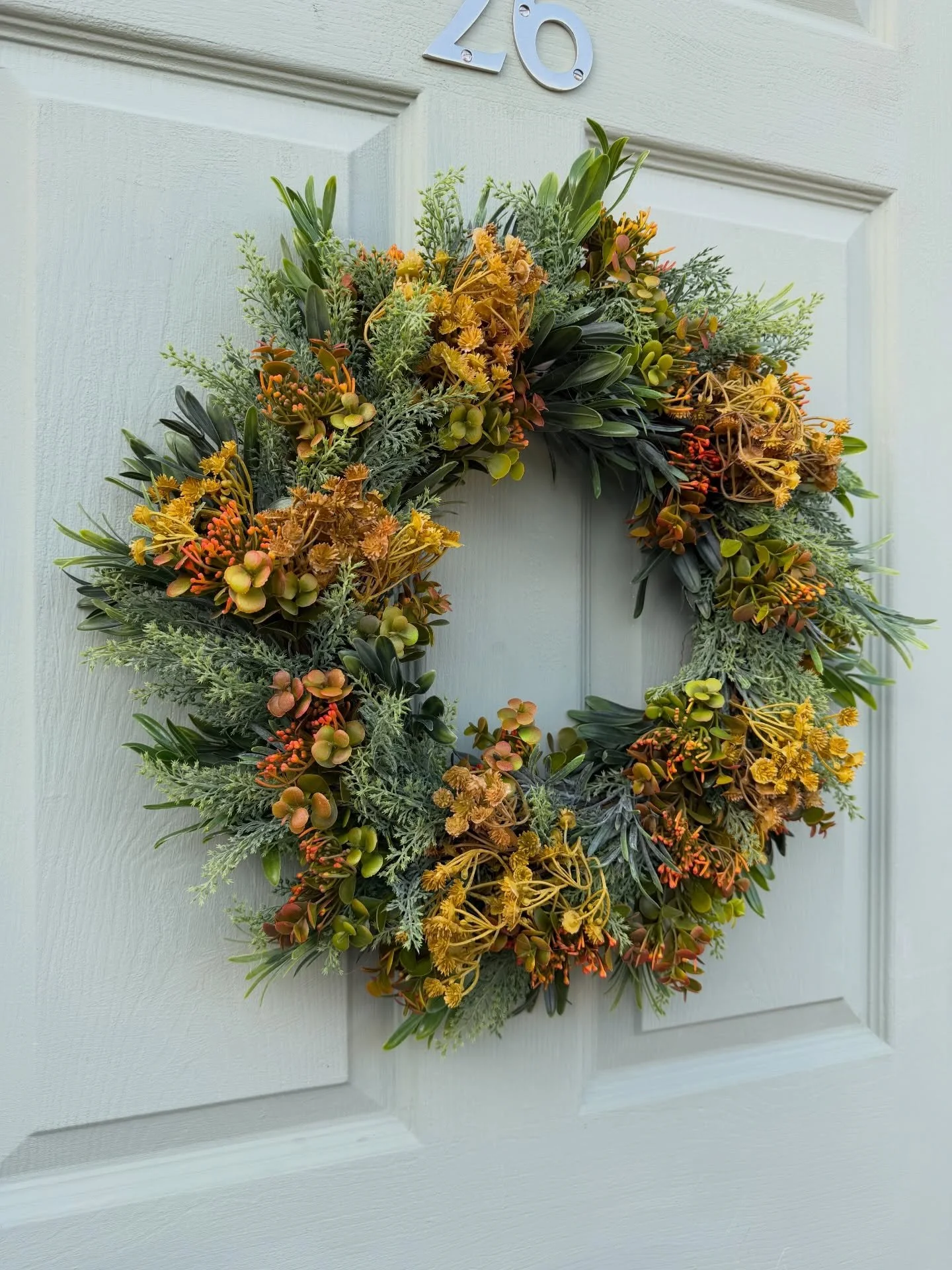 Built on a real grapevine base, this wreath layers several varieties of faux eucalyptus to create the kind of full, quietly lush look you might find tumbling over a garden wall. The rounded coin-leaf stems sit alongside finer, more delicate sprigs, giving the whole thing a convincing depth and movement. Tiny faux berry clusters — some in blush pink, others in soft cream and muted green — are tucked throughout, adding just enough colour to lift the greenery without tipping it into anything overtly floral.