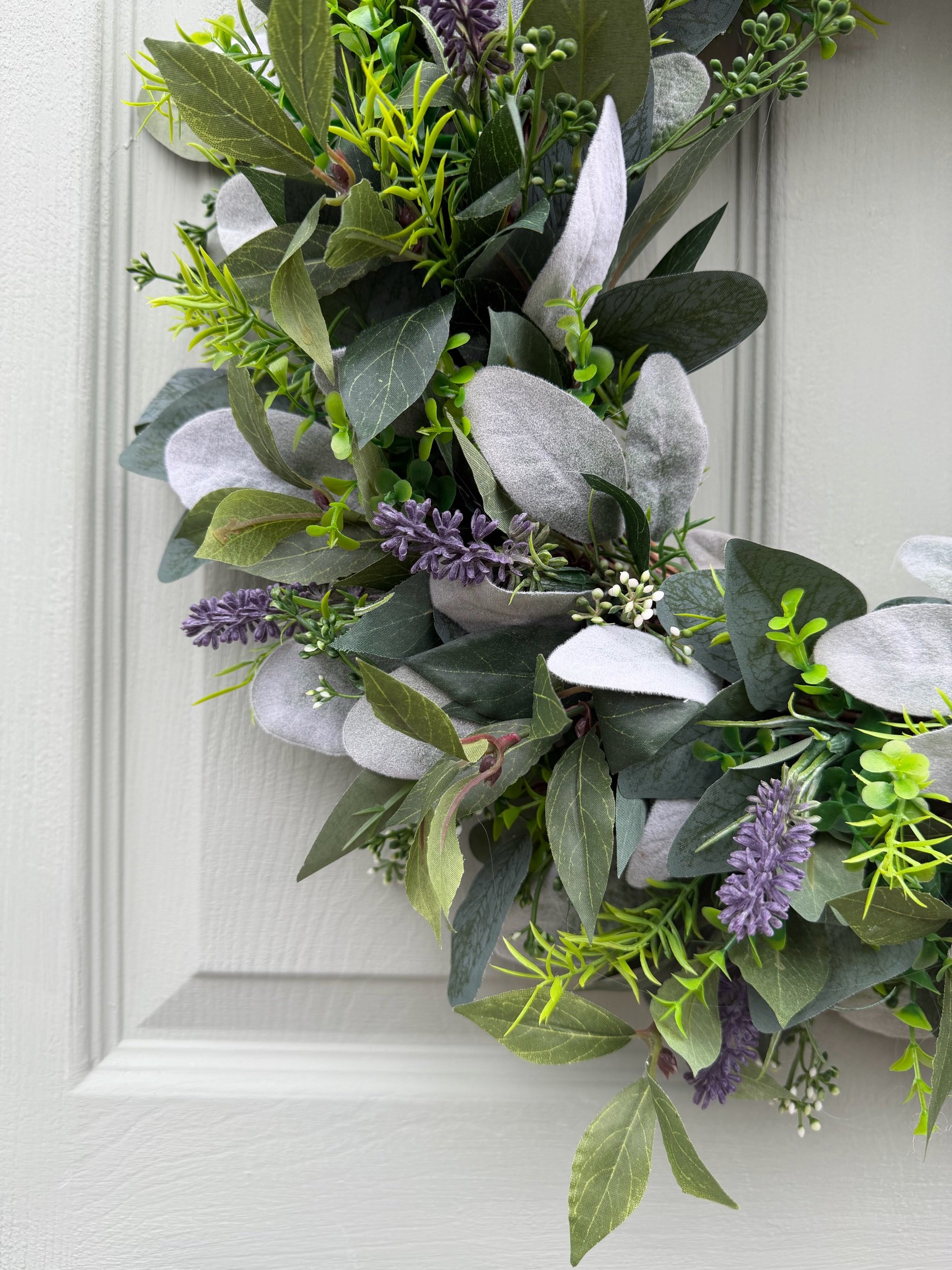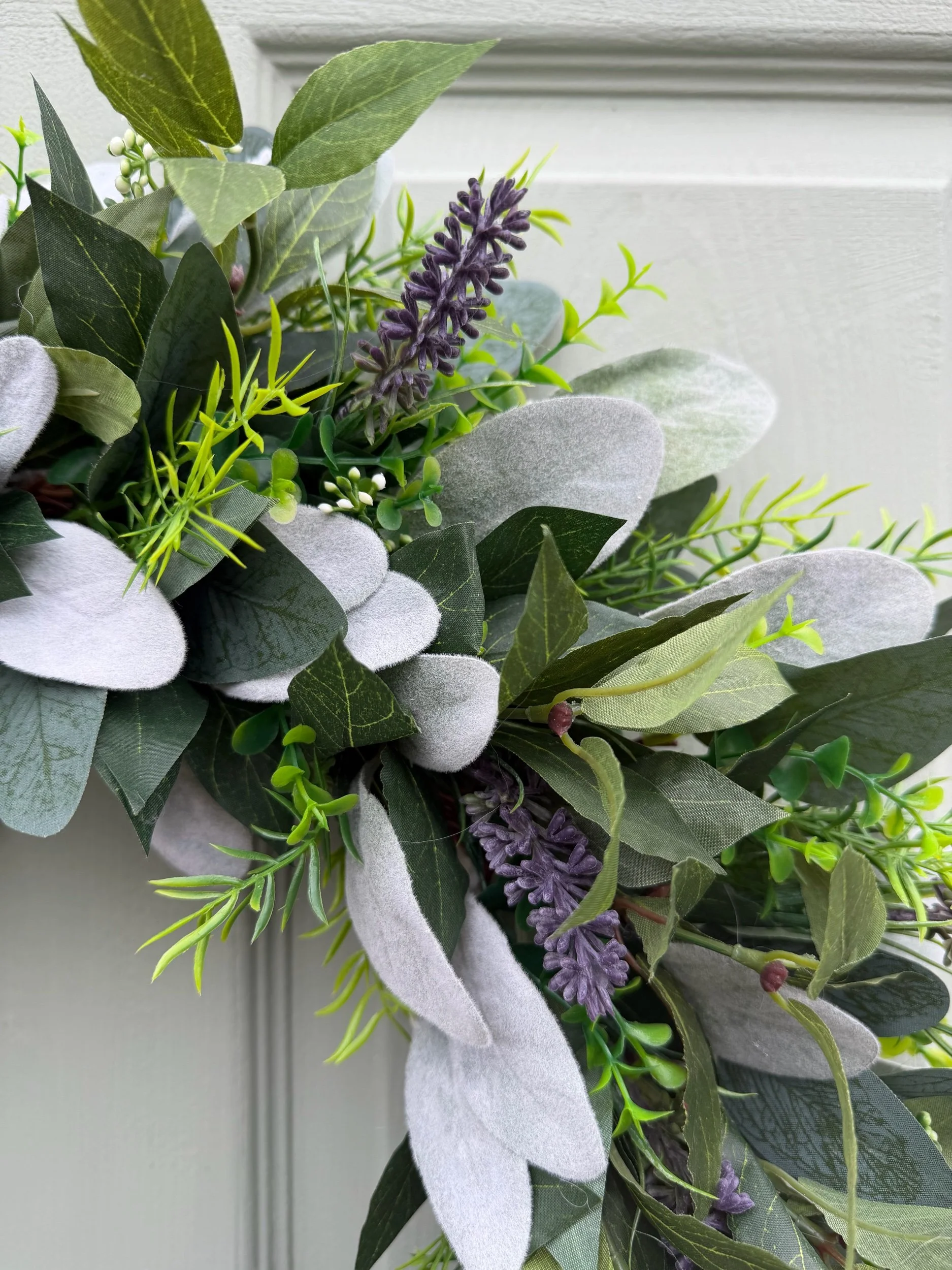 Woven amongst the abundant greenery are delicate sprays of purple lavender that bring gentle colour and the promise of aromatic fragrance. The lavender's slender spikes provide elegant vertical interest whilst maintaining the wreath's overall sense of calm restraint. Complementing these elements are fine, feathery sprigs in bright chartreuse that add subtle pops of fresh colour, whilst small white berry clusters create delicate highlights. The varying leaf shapes and textures—from the broad, rounded eucalyptus to the soft lamb's ear and fine needle-like details—create remarkable visual depth whilst maintaining a cohesive, peaceful aesthetic.