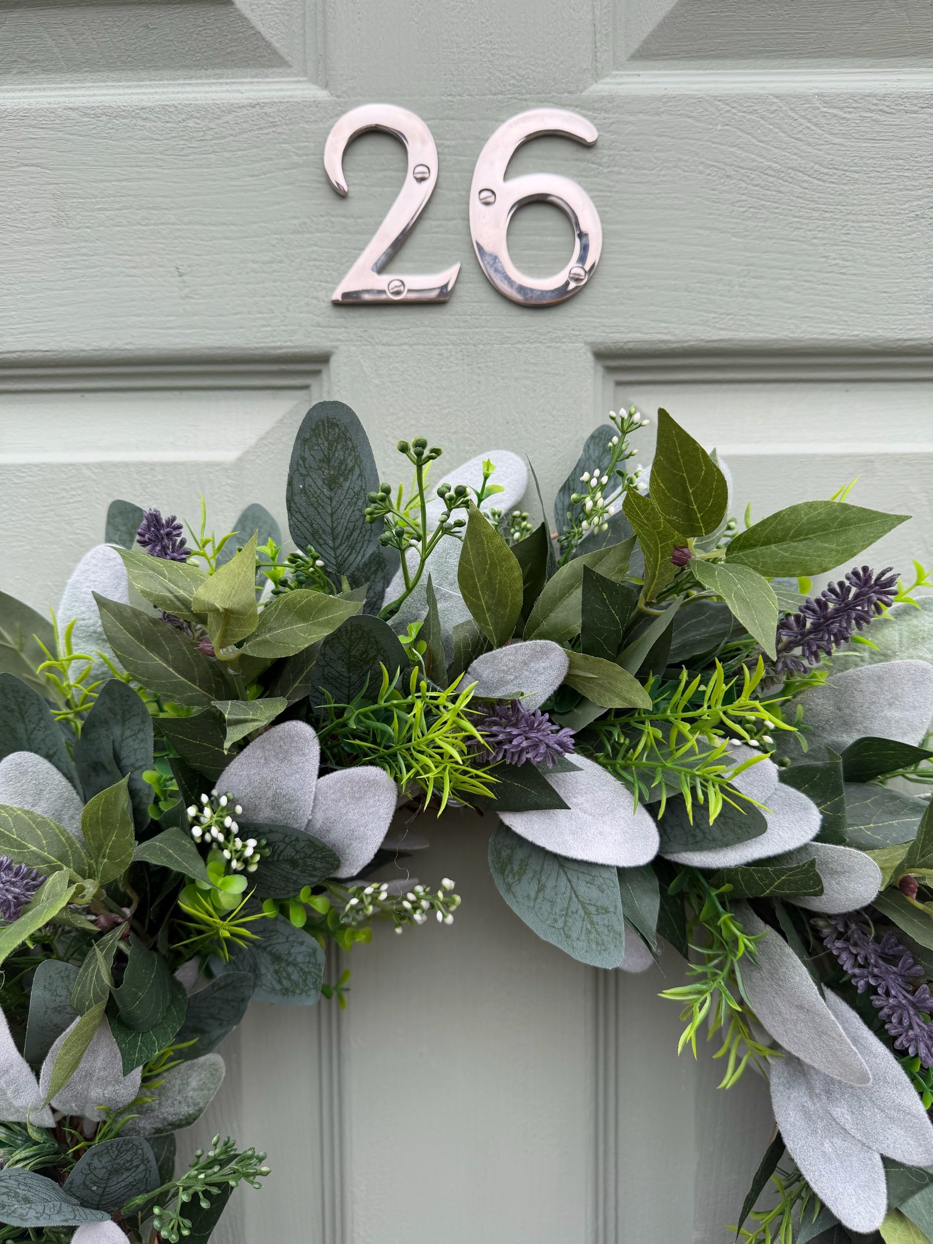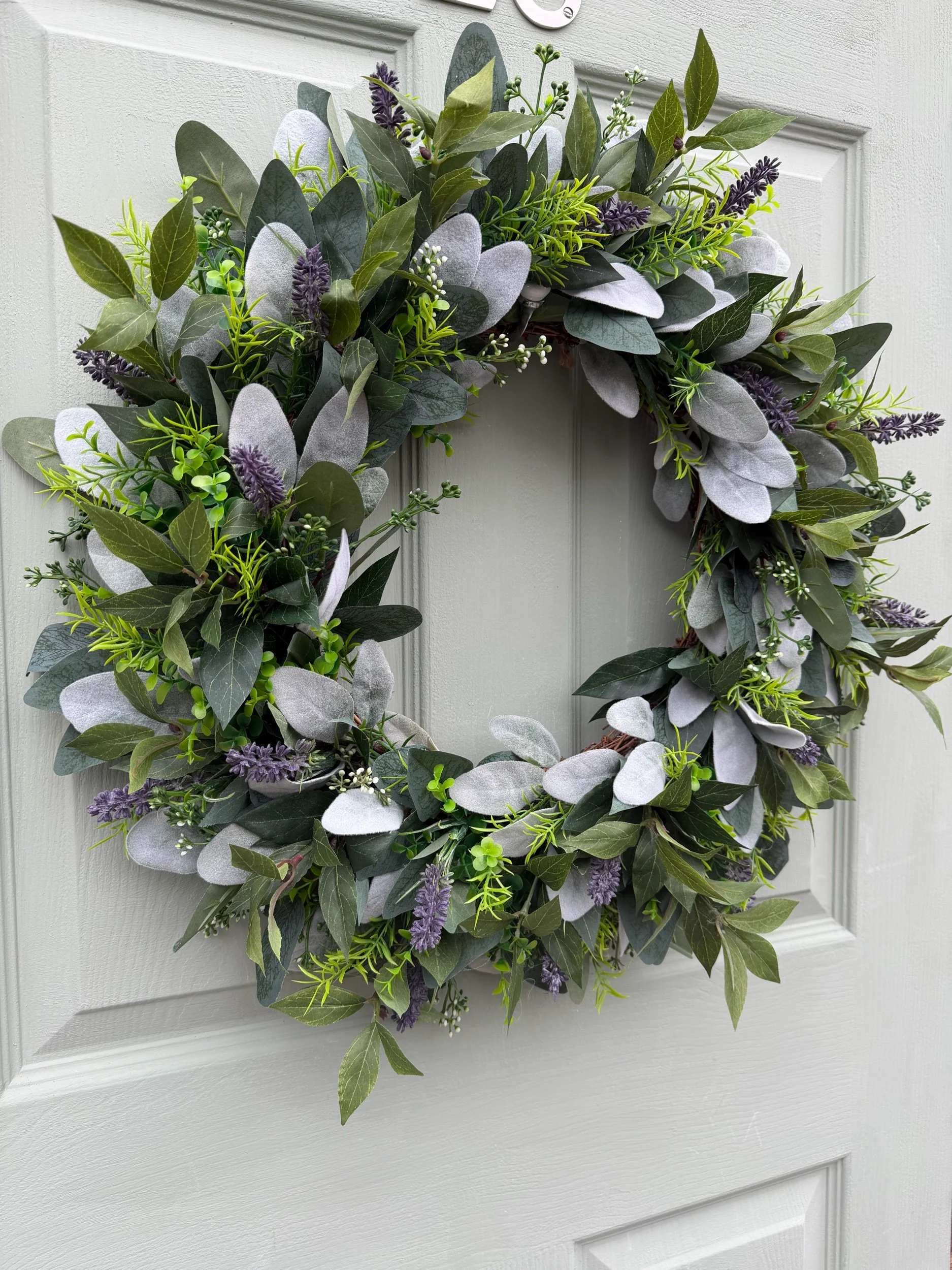 This versatile wreath embodies contemporary botanical elegance with its emphasis on foliage over flowers and its soothing, neutral palette. The muted greys, greens, and soft purple tones work beautifully year-round, creating gentle visual harmony with the sage door as shown. Whether displayed throughout the seasons or reserved for spring and summer, its calming colours and abundant textures create a welcoming statement that brings the peaceful, aromatic beauty of a herb garden directly to your entrance.